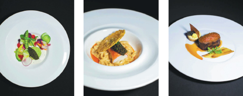 From left: Three of Thomas Keller's signature dishes — Hass Avocado and Kaluga Queen organic caviar (10 years )"Louie"; Macaroni and cheese; steak and eggs. [Photo provided to China Daily]