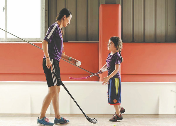 Chen Xin coaches her daughter in floorball in Songjiang district, Shanghai, in 2013. [Photo provided to China Daily]